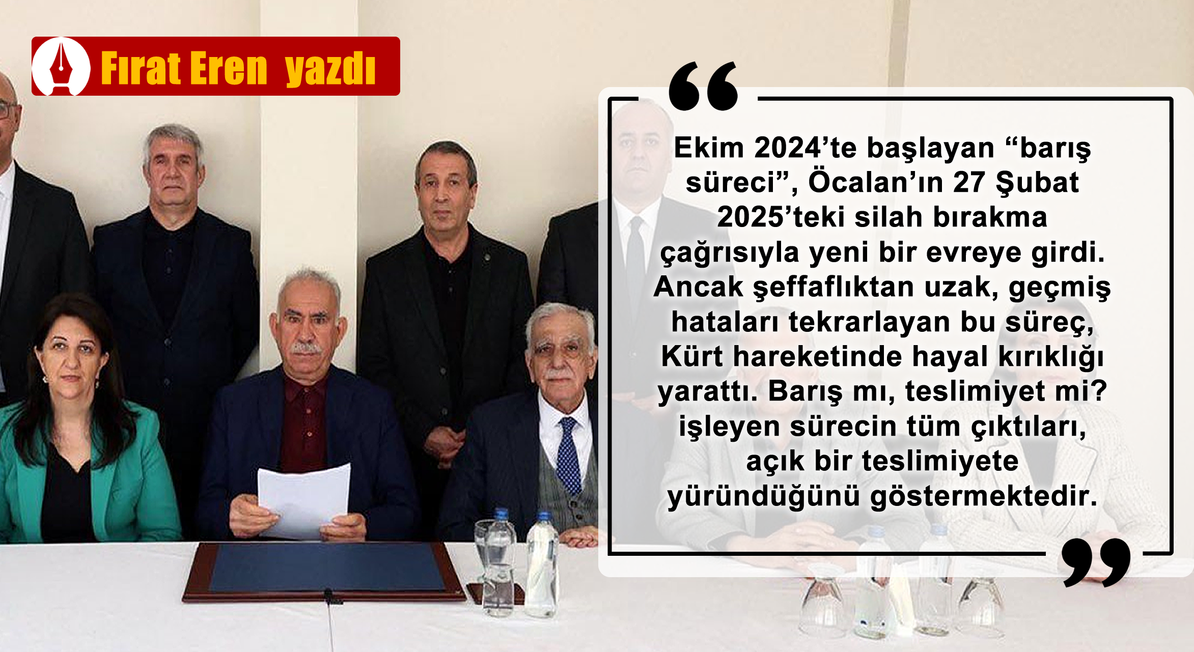 Ekim 2024’den bugüne siyasal sürecin merkezine, T.C. Devleti ile PKK arasında yarım asra yaklaşan savaşın bitirilmesine dönük “adı konulamayan” görüşmeler silsilesi oturdu. Devlet Bahçeli’nin MHP grubunda yaptığı konuşma ile ülke gündeminde dolaşıma sokulan süreç, elbette ki daha önceden devlet yetkilileri ile Öcalan arasında varılan mutabakatın sonucuydu. İlk etapta Kürt ulusal hareketinin bir parçasını temsil eden DEM Parti’nin yetkili ağızlarından, kontrollü açıklamalarla yeni bir barış sürecinin destekçisi olacaklarına dair cümleler döküldü. Akabinde oluşturulan heyetler İmralı ve burjuva düzen partilerine ziyaretlerde bulunarak, görüşmeler gerçekleştirdi. Günün sonunda 27 Şubat 2025 tarihinde Öcalan’ın kaleme aldığı metin, Taksim’deki bir otelde canlı yayın eşliğinde okunarak Türkiye/Kuzey Kürdistan ve dünya kamuoyuyla paylaşıldı. Özellikle Kürt yurtsever çevrede büyük bir hayal kırıklığı ve kafa karışıklığı yaratan sürecin öne çıkan tuhaflıklarını tespit etmeye çalışalım.
