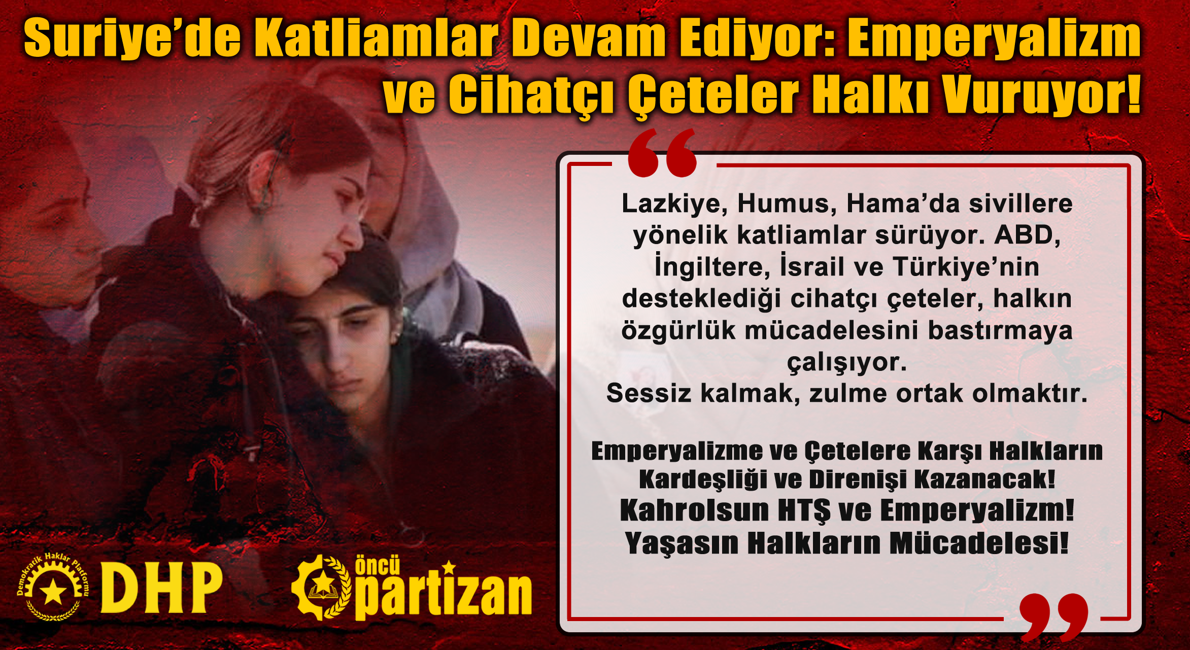 Suriye’de yaşanan vahşet, emperyalist güçlerin ve onların bölgedeki işbirlikçilerinin insanlık dışı yüzünü bir kez daha tüm çıplaklığıyla ortaya koyuyor. Lazkiye, Tartus, Humus ve Hama gibi Alevi nüfusun yoğun olduğu bölgelerde, kadın, çocuk, yaşlı demeden sivillere yönelik katliamlar, insanlık tarihinin kara bir lekesi olarak kayda geçiyor. Bu katliamlar, sadece Suriye halklarına değil, tüm insanlığa karşı işlenmiş suçlardır. Ancak bu vahşet, halkların özgürlük ve direniş iradesini kırmak bir yana, daha da güçlendiriyor. Çünkü halklar, artık emperyalistlerin ve onların uşaklarının yarattığı bu cehenneme boyun eğmeyeceklerini her fırsatta haykırıyor.